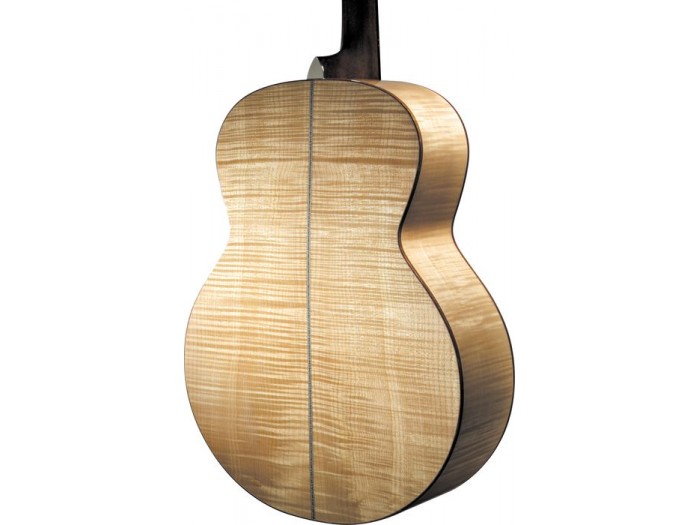 Guitar features include a solid flame maple back and sides, solid spruce top with scalloped bracing and a one-piece mahogany neck with traditional dovetail neck joint. Other features include ebony fingerboard and bridge, ebony pearl dot-inlay bridge pins and strap buttons, classic pearl fingerboard inlays, wood bindings, bone nut and bone compensated saddle, Grover Rotomatic tuners and a wooden arched guitar case.