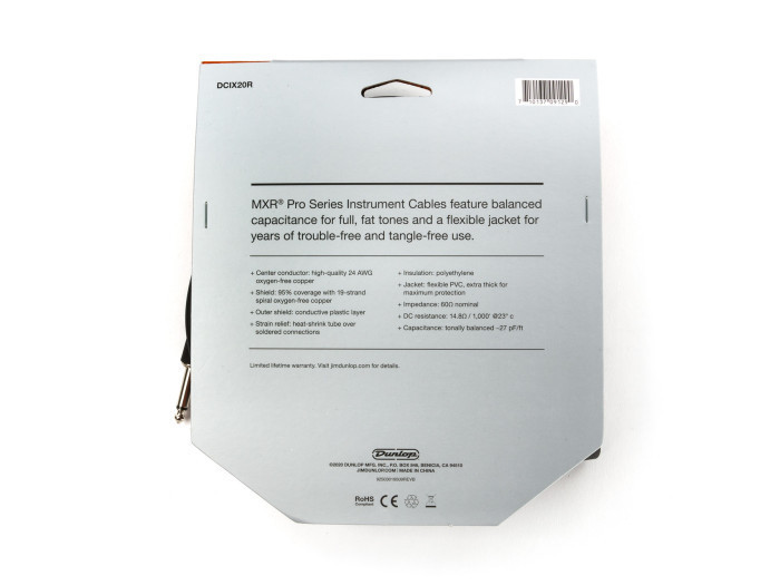 MXR instrument cables are designed by musicians for musicians with tone and durability in mind. "Sweet Spot" capacitance means these cables are designed to translate the right tonal harmonics from pickups that enable both guitars and basses to sound big and rich, whether acoustic or electric. Oxygen-free copper (OFC) conductors keep your instrument's tone pure and OFC spiral shielding blocks unwanted interference while keeping the cable flexible and lightweight. PVC outer jacket enhances flexibility and noise rejection while providing additional protection. Available in 10' and 20' lengths, with straight/straight and straight/right-angle ends. Limited lifetime warranty available worldwide.