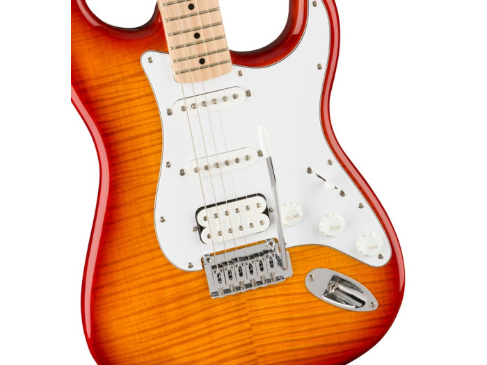 A superb gateway into the time-honored Fender® family, the Squier® Affinity Series® Stratocaster® FMT HSS delivers legendary design and quintessential tone for today’s aspiring guitar hero. This Strat® features several player-friendly refinements such as a thin and lightweight body with an eye-catching flame maple top (FMT), a slim and comfortable “C”-shaped neck profile, a 2-point tremolo bridge for superior tremolo action and sealed die-cast tuning machines with split shafts for smooth, accurate tuning and easy restringing. Loaded with a Squier humbucking bridge pickup and single-coil neck and middle pickups for genre-defying sonic variety, this model is ready to accompany any player at any stage.
