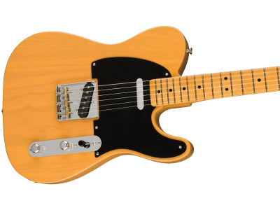 The American Vintage II 1951 Telecaster features an ash body finished in Butterscotch Blonde to capture the tone and look of the original. The substantial ‘51 “U”-shaped hard rock maple neck plays like a dream with a 7.25” radius fingerboard and vintage tall frets. Characteristic of production in 1951, 12th fret face-dot spacing is narrow and the sole Phillips-head fastener on the guitar is at the truss rod nut. The triple brass saddle bridge, single-line “Fender Deluxe” tuners and Pure Vintage '51 Telecaster pickups deliver classic twang and authentic Fender style.