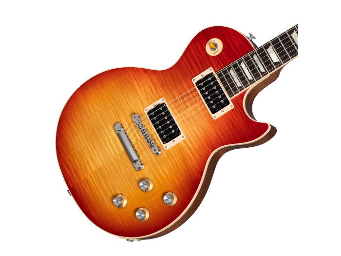 The new Les Paul™ Standard returns to the classic design that made it relevant, played, and loved -- shaping sound across generations and genres of music. It pays tribute to Gibson's Golden Era of innovation and brings authenticity back to life. The Les Paul Standard 60s features a satin nitrocellulose lacquer finish that gives it the look and feel of a long-treasured musical companion. It has a solid mahogany body with an AA figured maple top and a SlimTaper™ 60s-style mahogany neck with a rosewood fingerboard and trapezoid inlays. It's equipped with an ABR-1 Tune-O-Matic™ bridge, aluminum Stop Bar tailpiece, Grover® Rotomatic "Kidney" tuners, and gold Top Hat knobs with Silver Reflectors and Dial Pointers. The open-coil 60s Burstbucker™ pickups are loaded with Alnico 5 magnets and hand-wired to audio taper potentiometers and Orange Drop® capacitors.