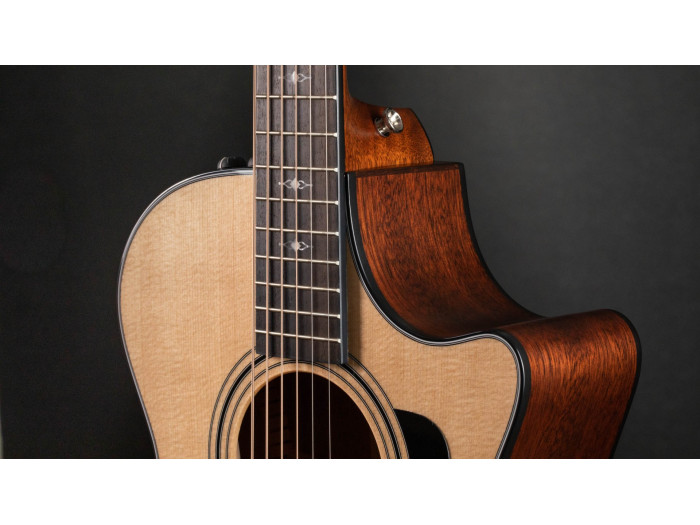 The top wood of the 326ce is crafted from solid Mahogany, which contributes to its warm and focused tone. Mahogany is known for its strong midrange presence and excellent sustain, making it suitable for a wide range of musical styles. The back and sides are made of solid Tasmanian Blackwood, adding depth, complexity, and a touch of sparkle to the guitar's sound.