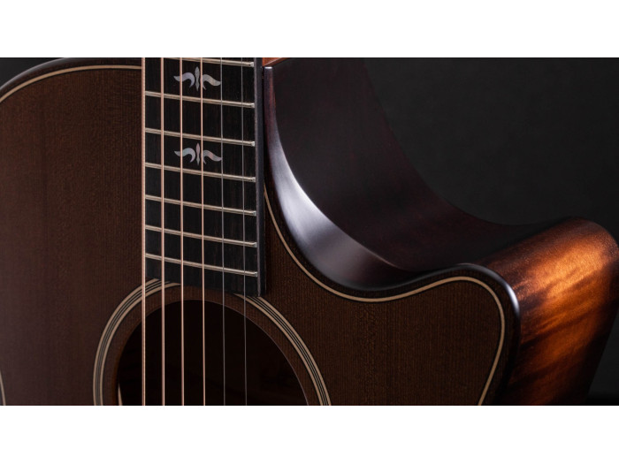 The neck of the Builder's Edition 614ce WHB is crafted from tropical mahogany and features Taylor's ergonomic armrest bevel, providing enhanced comfort and reducing fatigue during long playing sessions. The fingerboard is made of West African Crelicam ebony, which offers a smooth playing surface and contributes to the guitar's excellent note definition and sustain.