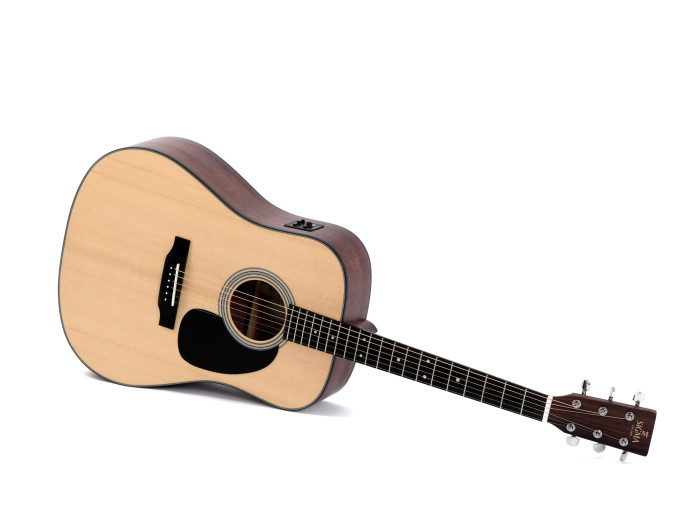 The Sigma SDM-STE features a dreadnought body size, making it suitable for powerful and resonant acoustic sound. The solid Sitka spruce top contributes to its clear and balanced tone, while the mahogany back and sides provide warmth and depth. The mahogany neck has a low profile, ensuring comfortable playability. The bone nut and saddle enhance the guitar's sustain and tonal response.
