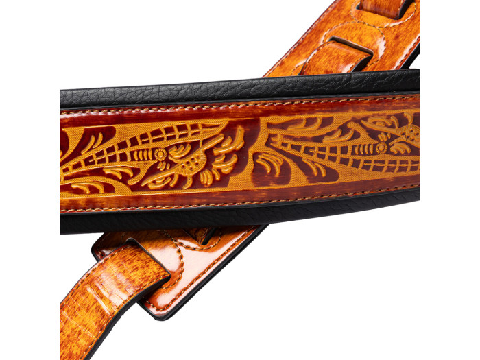 Light brown padded distressed leatherette guitar strap with pressed flower pattern