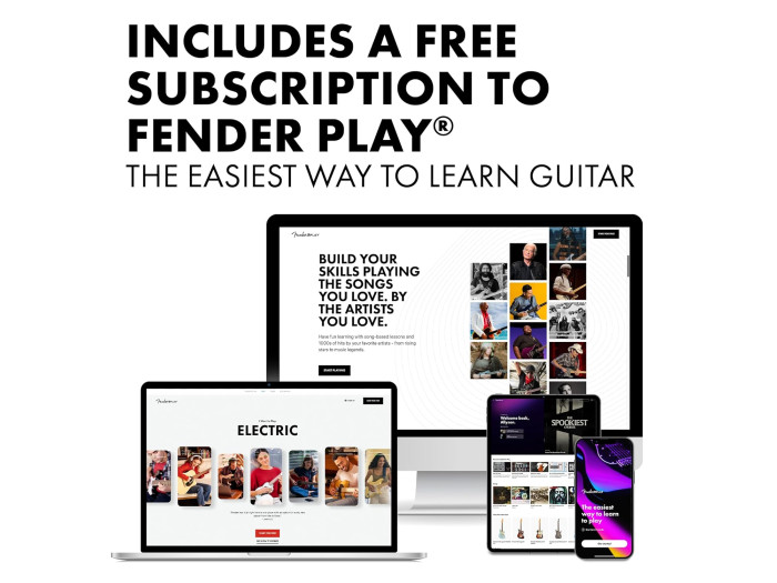Designed by Fender® in California and an icon of rock & roll, the Debut Collection™ Stratocaster® features a slim “C”-shaped neck profile and a thin, lightweight body for a comfortable playing feel while three single-coil pickups with 5-way switching offer a wide variety of classic Strat® tones. Further details of this model include a tremolo bridge with removable arm for exciting string-bending effects, sealed-gear tuning machines for smooth, accurate tuning action and durable chrome hardware for a premium look.