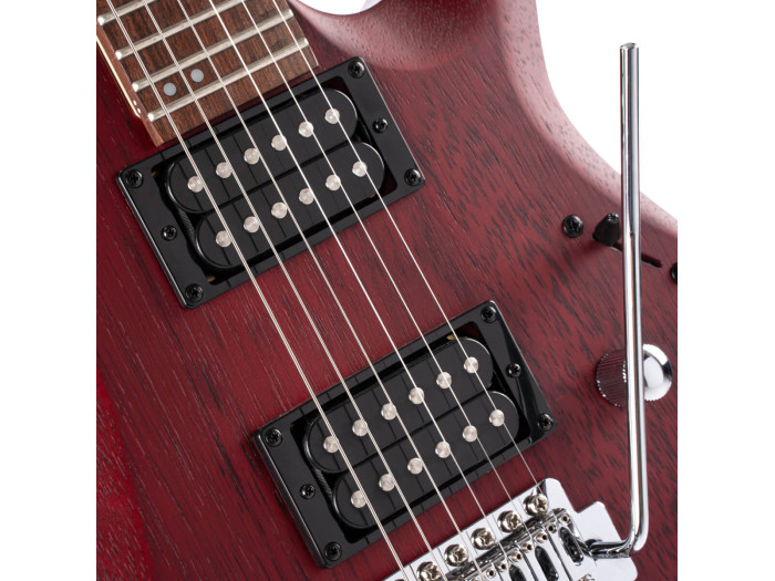 The entry level model of the new X Series, the X100 features the same slick and fast playability of the higher-end X Series models with Meranti body wood and hard rock Maple neck, Jatoba for fingerboard with 400mm(15.75”) radius, two high output humbucker pickups, and 6-point tremolo system available in three open pore finishes: Black, Black Cherry, and Black Cherry Burst.