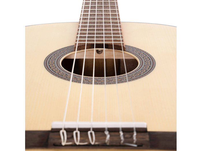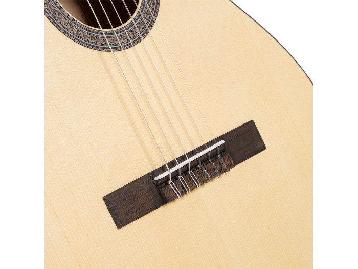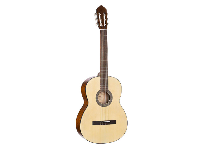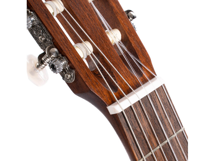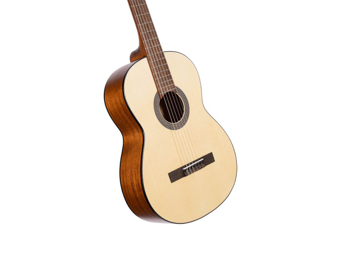 The traditional style AC models have been re-engineered to improve resonance for an authentic classical guitar sound. The nice combination of tone-woods yields a traditional, deep and delightfully mellow tone. Cort AC series is very forgiving of student mistakes,requiring slightly less precision and sharpness for a good tone. AC100 features Spruce top, Mahogany back and sides, Merbau fingerboard and Savarez® cristal strings.
