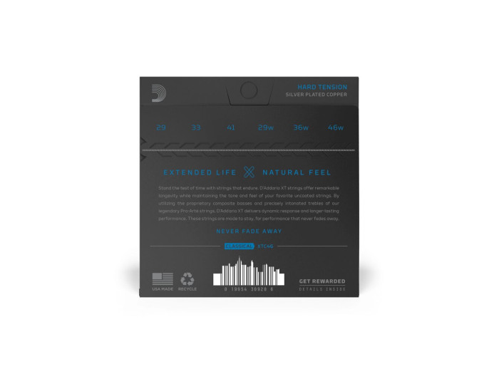 XT are our longest lasting classical strings, combining centuries of D’Addario expertise with modern coating technology. XT Classical features our composite basses, constructed with a long-lasting multifilament core, wrapped with silver-plated copper, and finished with our proprietary XT coating, for bold, projecting tone and extended life span. They’re complimented with our precision Pro-Arté nylon treble strings which provide the warm, mellow charm traditionalists love. This Hard tension set affords rich tone and strong projection.