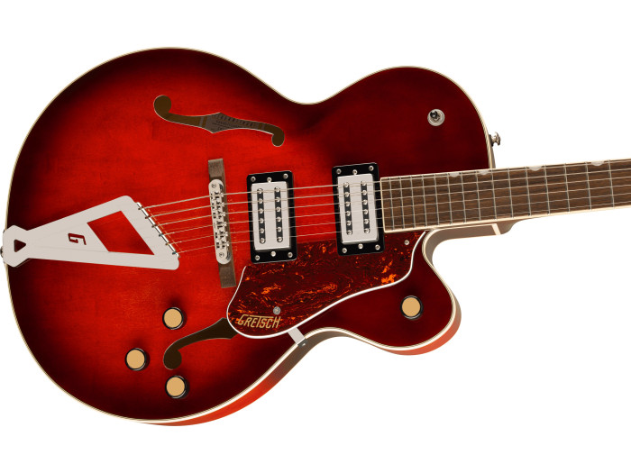 The G2420 Streamliner Hollow Body Single-Cut with Chromatic II tailpiece features a fully hollow arched maple body with parallel tone bars for rich fullness, deep resonance and "big-body sound."